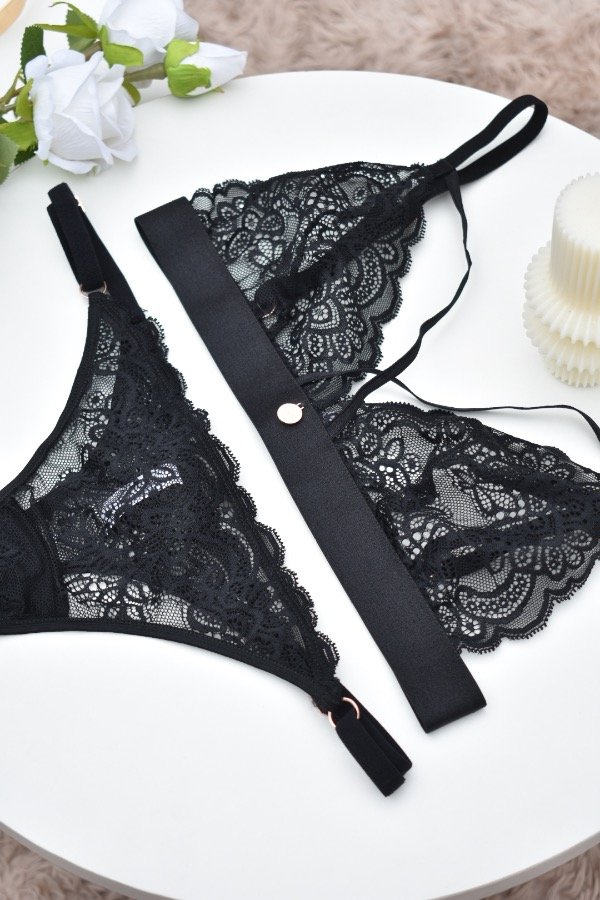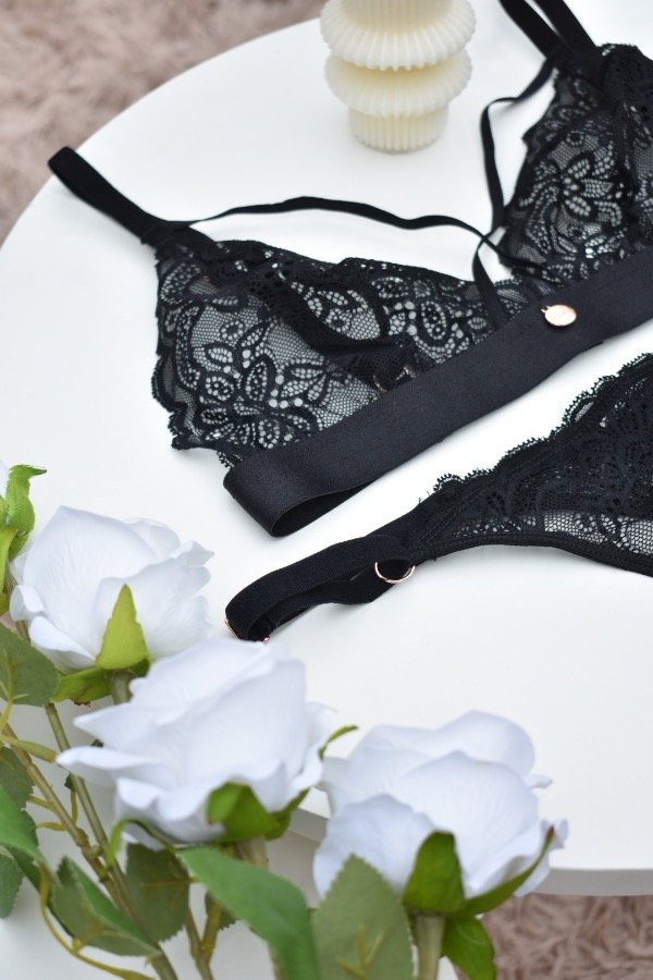 Conjunto de puntilla delicada con corpiño triangulito, que realza de forma natural.