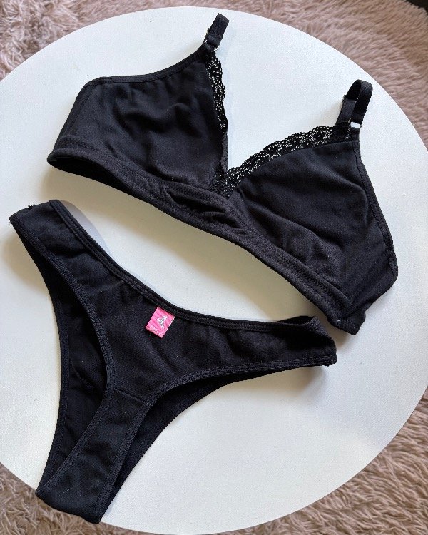 Conjunto de algodón y lycra de triángulo con base y less con galón de puntilla.